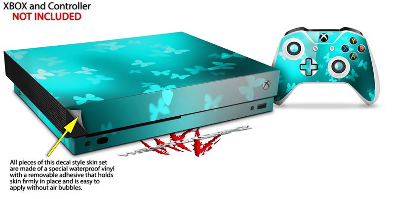 Skin Wrap for XBOX One X Console and Controller Bokeh Butterflies Neon Teal