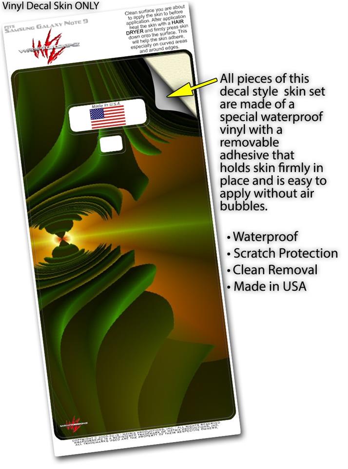 WraptorSkinz® skin wraps for the Samsung Galaxy Note 9 are printed using superb photo quality designs and vibrant colors printed with special fade resistant inks that last even in direct sun for years. WraptorSkinz are a composite of two layers of commercial grade materials. The bottom layer is a soft, flexible vinyl with a special removable adhesive that is easily positioned, applied without air bubbles. Next, we print the bottom layer with UV protected, fade resistant inks that deliver superb photo quality designs in vibrant colors. Finally, we bond a professional grade laminate over the entire Galaxy Note 9 skin adding a glossy protective finish. This product is not affiliated with or endorsed by Samsung.