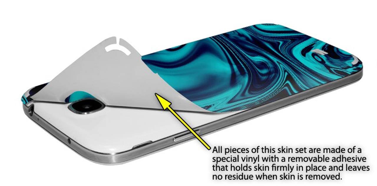 • Decal style vinyl skin covers front and back of Samsung Galaxy S4 phone.