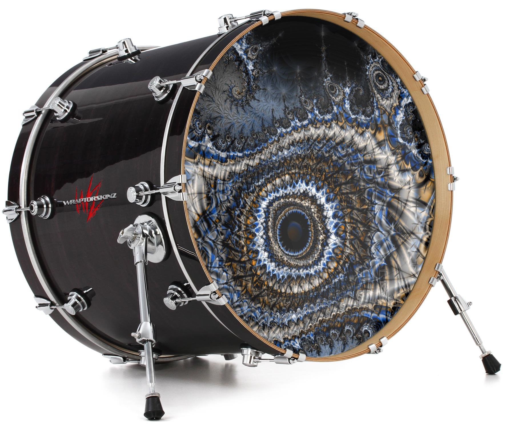 This design also available in other sizes. WraptorSkinz® skin wraps compatible with most kick drum heads. Printed using superb photo quality designs and vibrant colors printed with special fade resistant inks that last even in direct sun for years. WraptorSkinz are a composite three layer commercial grade materials vinyl. The bottom layer is a air release, grey block out removable adhesive that hides existing graphics on the drum head and is easily applied without air bubbles. The middle layer is a flexible vinyl printed with UV protected, fade resistant inks that deliver superb photo quality designs in vibrant colors. Finally, we bond a professional grade laminate over the entire skin adding a glossy protective finish.
