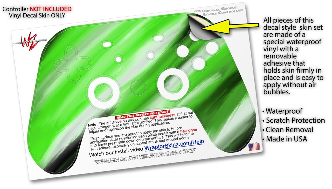 This product is in no way affiliated with or endorsed by Google. WraptorSkinz® skin wraps work with the Original Google Stadia version 1 Controller. Printed using superb photo quality designs and vibrant colors printed with special fade resistant inks that last even in direct sun for years. WraptorSkinz are a composite of two layers of commercial grade materials. The bottom layer is a soft, flexible vinyl with a special removable adhesive that is easily positioned, applied without air bubbles. Next, we print the bottom layer with UV protected, fade resistant inks that deliver superb photo quality designs in vibrant colors. Finally, we bond a professional grade laminate over the entire skin adding a glossy protective finish.