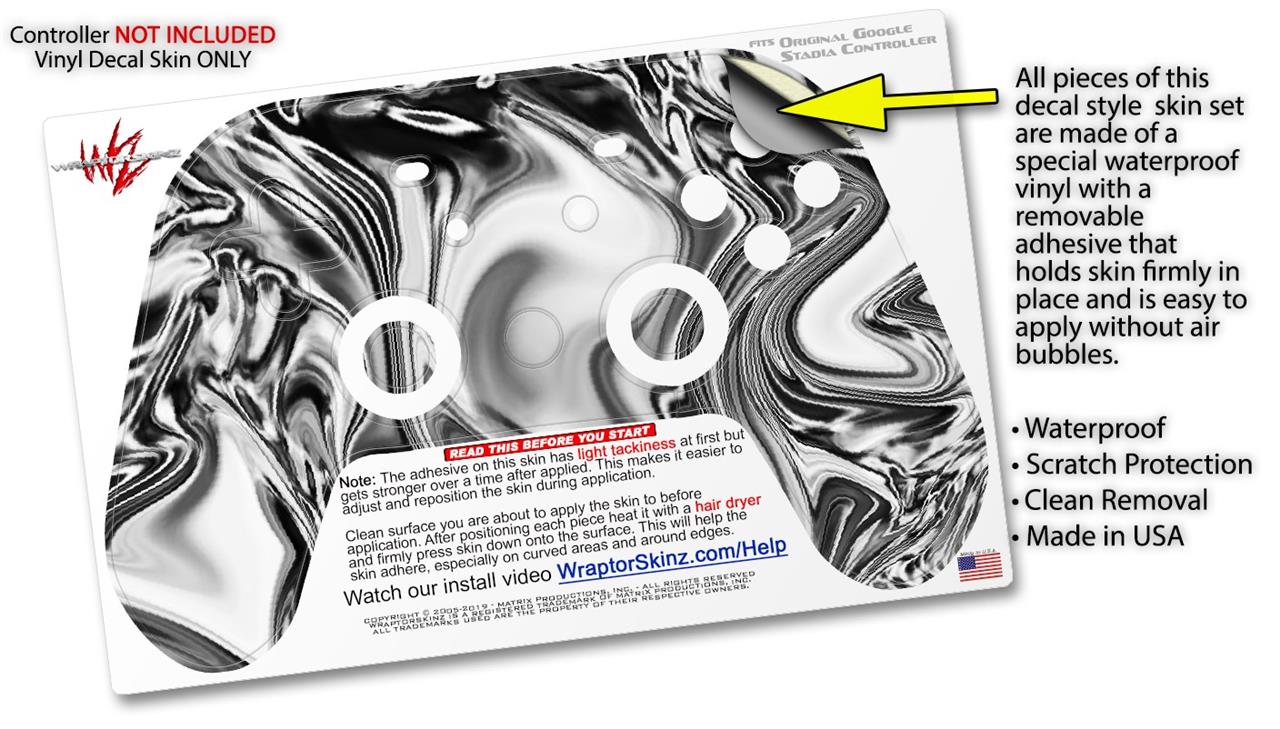This product is in no way affiliated with or endorsed by Google. WraptorSkinz® skin wraps work with the Original Google Stadia version 1 Controller. Printed using superb photo quality designs and vibrant colors printed with special fade resistant inks that last even in direct sun for years. WraptorSkinz are a composite of two layers of commercial grade materials. The bottom layer is a soft, flexible vinyl with a special removable adhesive that is easily positioned, applied without air bubbles. Next, we print the bottom layer with UV protected, fade resistant inks that deliver superb photo quality designs in vibrant colors. Finally, we bond a professional grade laminate over the entire skin adding a glossy protective finish.
