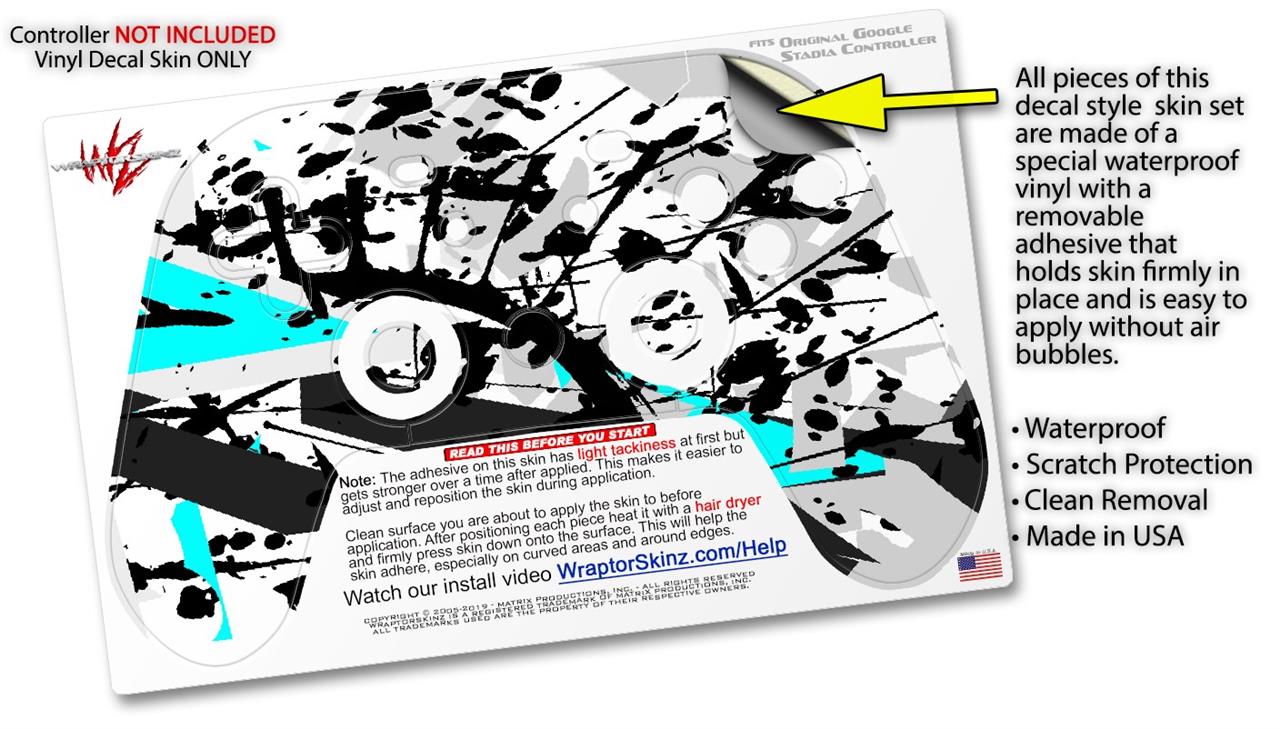 This product is in no way affiliated with or endorsed by Google. WraptorSkinz® skin wraps work with the Original Google Stadia version 1 Controller. Printed using superb photo quality designs and vibrant colors printed with special fade resistant inks that last even in direct sun for years. WraptorSkinz are a composite of two layers of commercial grade materials. The bottom layer is a soft, flexible vinyl with a special removable adhesive that is easily positioned, applied without air bubbles. Next, we print the bottom layer with UV protected, fade resistant inks that deliver superb photo quality designs in vibrant colors. Finally, we bond a professional grade laminate over the entire skin adding a glossy protective finish.