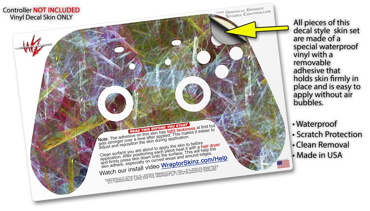 This product is in no way affiliated with or endorsed by Google. WraptorSkinz® skin wraps work with the Original Google Stadia version 1 Controller. Printed using superb photo quality designs and vibrant colors printed with special fade resistant inks that last even in direct sun for years. WraptorSkinz are a composite of two layers of commercial grade materials. The bottom layer is a soft, flexible vinyl with a special removable adhesive that is easily positioned, applied without air bubbles. Next, we print the bottom layer with UV protected, fade resistant inks that deliver superb photo quality designs in vibrant colors. Finally, we bond a professional grade laminate over the entire skin adding a glossy protective finish.
