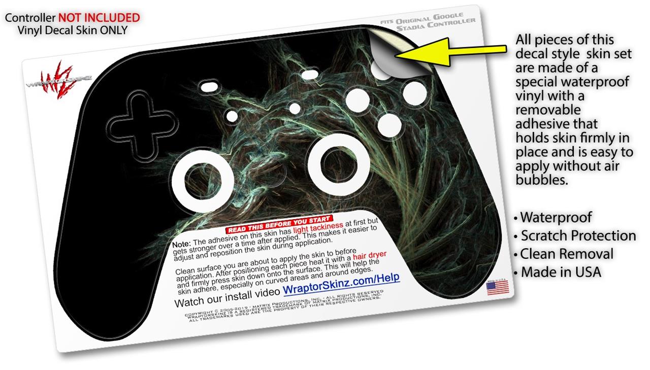This product is in no way affiliated with or endorsed by Google. WraptorSkinz® skin wraps work with the Original Google Stadia version 1 Controller. Printed using superb photo quality designs and vibrant colors printed with special fade resistant inks that last even in direct sun for years. WraptorSkinz are a composite of two layers of commercial grade materials. The bottom layer is a soft, flexible vinyl with a special removable adhesive that is easily positioned, applied without air bubbles. Next, we print the bottom layer with UV protected, fade resistant inks that deliver superb photo quality designs in vibrant colors. Finally, we bond a professional grade laminate over the entire skin adding a glossy protective finish.