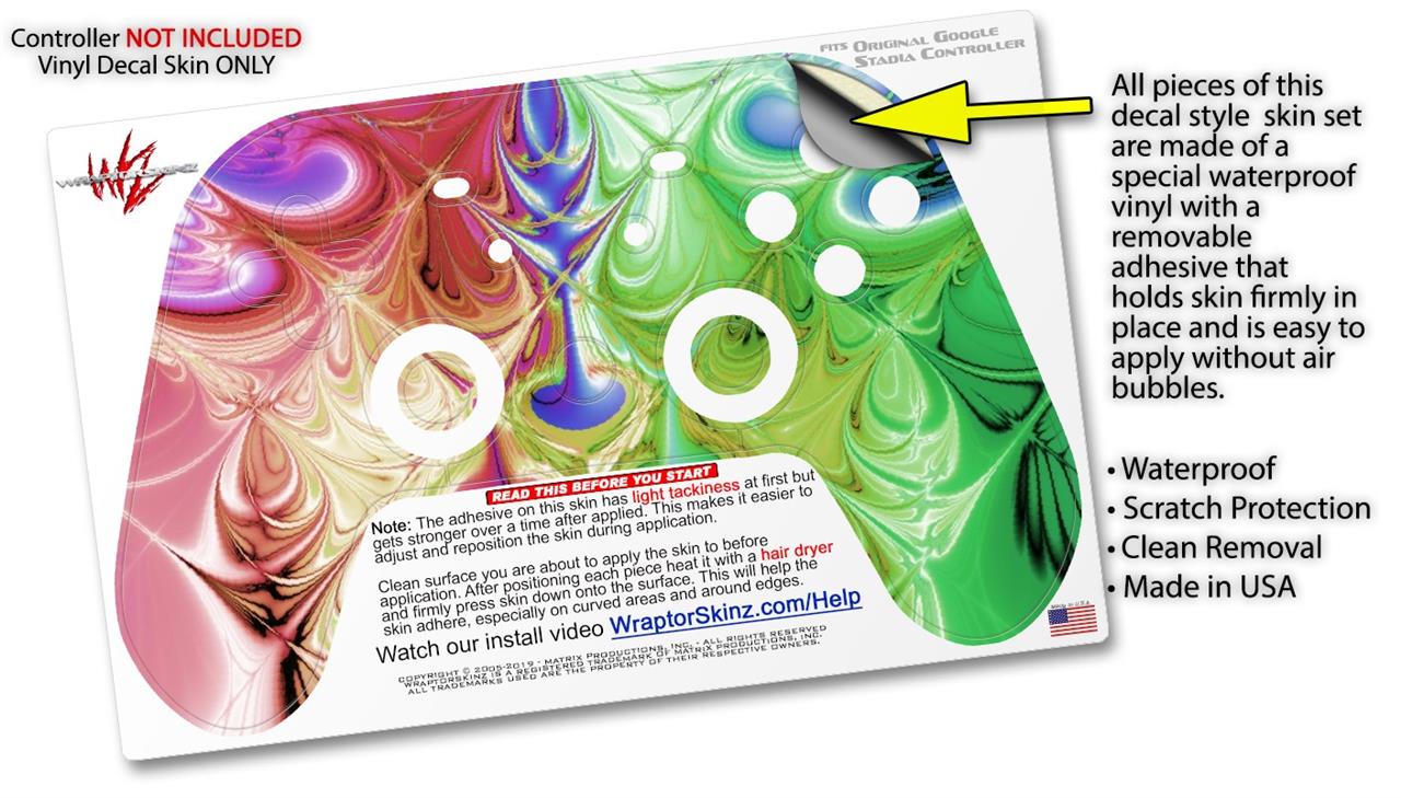 This product is in no way affiliated with or endorsed by Google. WraptorSkinz® skin wraps work with the Original Google Stadia version 1 Controller. Printed using superb photo quality designs and vibrant colors printed with special fade resistant inks that last even in direct sun for years. WraptorSkinz are a composite of two layers of commercial grade materials. The bottom layer is a soft, flexible vinyl with a special removable adhesive that is easily positioned, applied without air bubbles. Next, we print the bottom layer with UV protected, fade resistant inks that deliver superb photo quality designs in vibrant colors. Finally, we bond a professional grade laminate over the entire skin adding a glossy protective finish.