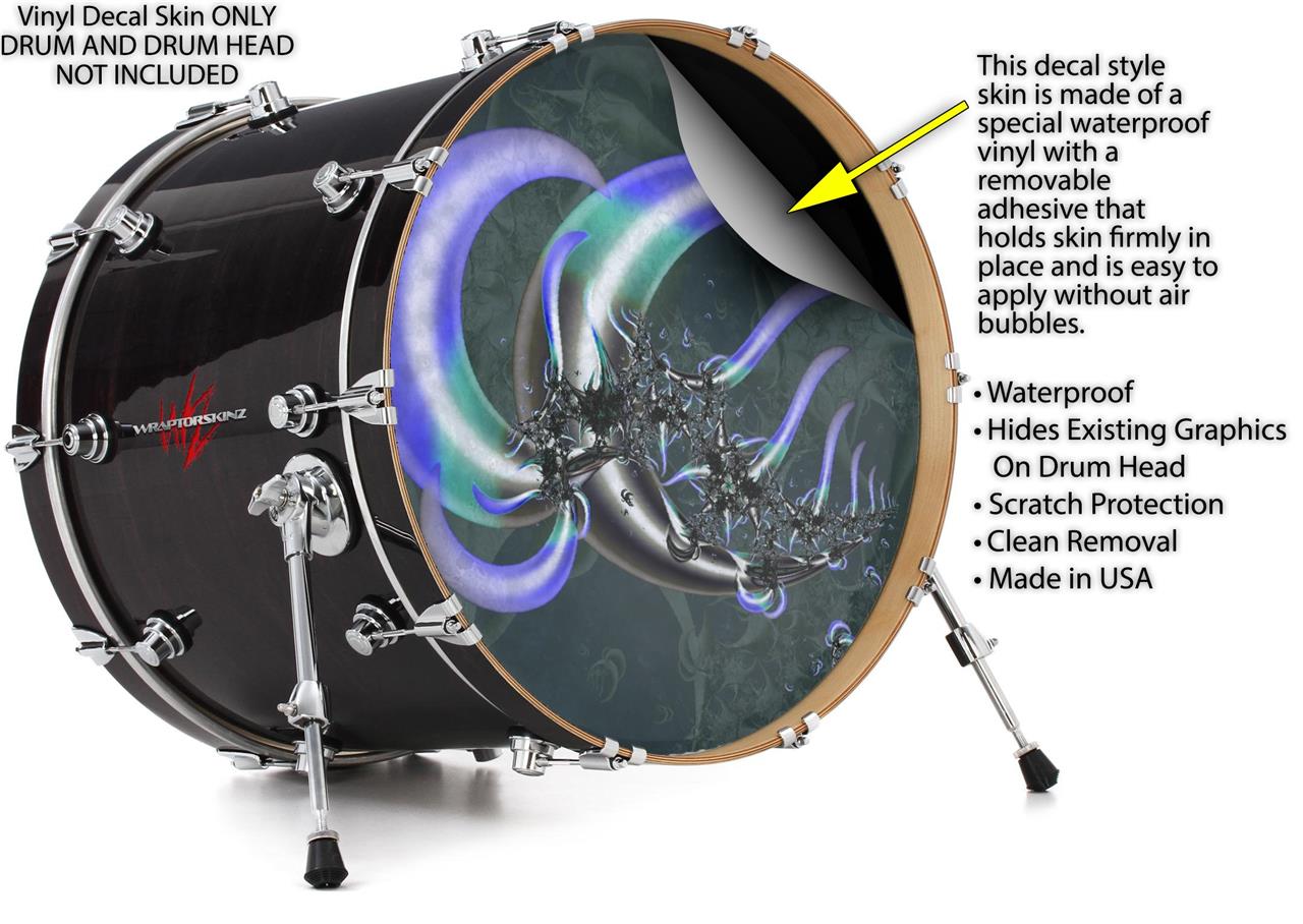 This design also available in other sizes. WraptorSkinz® skin wraps compatible with most kick drum heads. Printed using superb photo quality designs and vibrant colors printed with special fade resistant inks that last even in direct sun for years. WraptorSkinz are a composite three layer commercial grade materials vinyl. The bottom layer is a air release, grey block out removable adhesive that hides existing graphics on the drum head and is easily applied without air bubbles. The middle layer is a flexible vinyl printed with UV protected, fade resistant inks that deliver superb photo quality designs in vibrant colors. Finally, we bond a professional grade laminate over the entire skin adding a glossy protective finish.