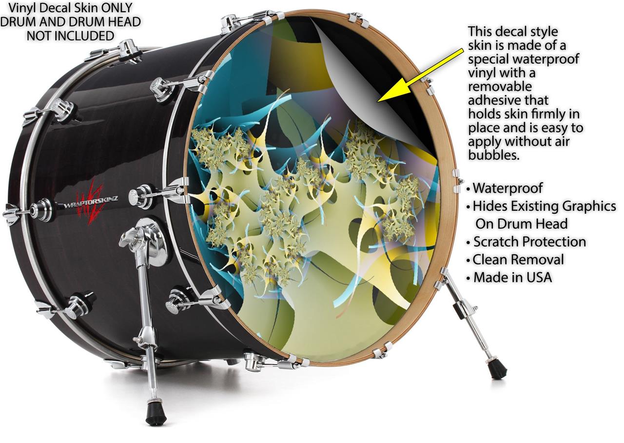 This design also available in other sizes. WraptorSkinz® skin wraps compatible with most kick drum heads. Printed using superb photo quality designs and vibrant colors printed with special fade resistant inks that last even in direct sun for years. WraptorSkinz are a composite three layer commercial grade materials vinyl. The bottom layer is a air release, grey block out removable adhesive that hides existing graphics on the drum head and is easily applied without air bubbles. The middle layer is a flexible vinyl printed with UV protected, fade resistant inks that deliver superb photo quality designs in vibrant colors. Finally, we bond a professional grade laminate over the entire skin adding a glossy protective finish.