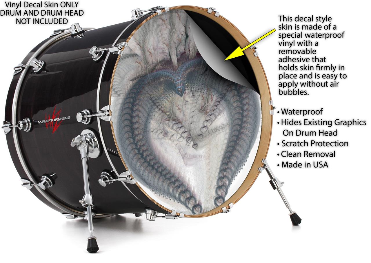 This design also available in other sizes. WraptorSkinz® skin wraps compatible with most kick drum heads. Printed using superb photo quality designs and vibrant colors printed with special fade resistant inks that last even in direct sun for years. WraptorSkinz are a composite three layer commercial grade materials vinyl. The bottom layer is a air release, grey block out removable adhesive that hides existing graphics on the drum head and is easily applied without air bubbles. The middle layer is a flexible vinyl printed with UV protected, fade resistant inks that deliver superb photo quality designs in vibrant colors. Finally, we bond a professional grade laminate over the entire skin adding a glossy protective finish.