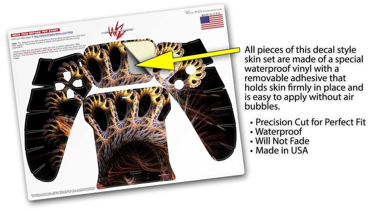 WraptorSkinz® skin wraps for the Sony Playstation 5 controller are printed using superb photo quality designs and vibrant colors printed with special fade resistant inks that last even in direct sun for years. WraptorSkinz are a composite of two layers of commercial grade materials. The bottom layer is a soft, flexible vinyl with a special removable adhesive that is easily positioned, applied without air bubbles. Next we print the bottom layer with UV protected, fade resistant inks that deliver superb photo quality designs in vibrant colors. Last, we bond a professional grade laminate over the entire skin adding a glossy protective finish. This product is not affiliated with or endorsed by Sony or the Playstation brand.