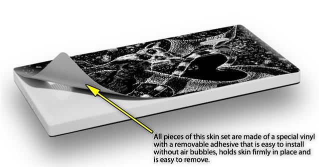 uSkins™ are self adhering vinyl skins that help prevent scratches and look great doing it. Unlike bulky silicon, plastic or metal cases and faceplates, uSkins are designed to be thin and very tough. uSkins are a composite of two layers of commercial grade materials. The bottom layer is a soft, flexible vinyl with a special removable adhesive that is easily positioned, applied without air bubbles, and effortlessly removed without leaving a sticky residue. Next we print the bottom layer with UV protected, fade resistant inks that deliver superb photo quality designs in vibrant colors. Finally we bond a professional grade laminate over the entire skin adding a glossy protective finish.