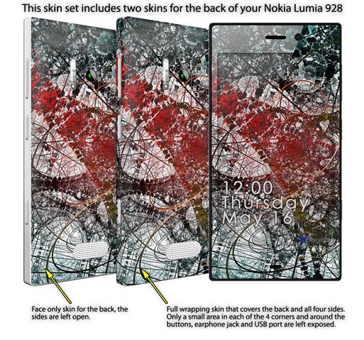 • Decal style vinyl skin covers front, back and side of Nokia Lumia 928 phone.