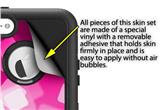 uSkins™ are self adhering vinyl decal style skins and are a great way to add a new look to your existing protective case. uSkins are a composite of two layers of commercial grade materials. The bottom layer is a soft, flexible vinyl with a special removable adhesive that is easily positioned, applied without air bubbles. Next we print the bottom layer with UV protected, fade resistant inks that deliver superb photo quality designs in vibrant colors. Finally we bond a professional grade laminate over the entire skin adding a glossy protective finish.