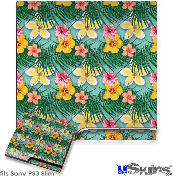 Decal Skin compatible with Sony PS3 Slim Beach Flowers 02 Seafoam Green